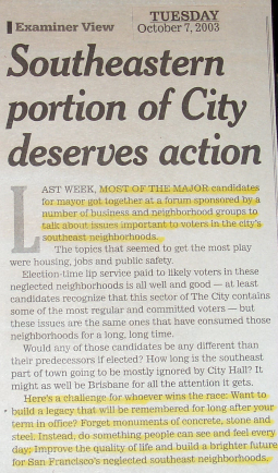 It is unconscionable that it has taken her bid for re-election to awaken District 10 Supervisor, Sophie Maxwell from her slumber. The reality is that, for the past 5 years of her term in office, the Southeast communities - particularly Bayview and Visitacion Valley - have been under siege from violence, while Maxwell has done nothing. Now, on the heels of another violent killing, Maxwell's political posturing not only rings hollow and opportunistic, but is offensive to the victims of this tragedy. At this late date, rather than being divisive and pointing the finger of responsibility elsewhere, Maxwell should take a cue from Mayor Newsom's "City Safe" initiative, and work to bring our community organizations and our Police together in order to fight crime at its root causes. The residents of the Southeast thirst for real leadership, and that means a public official who spends less time trying to keep her job and more time doing her job. |
