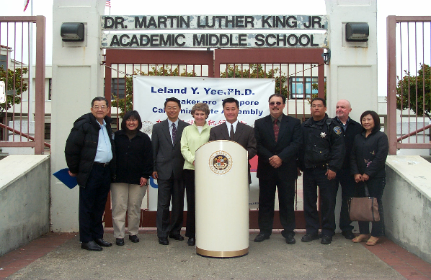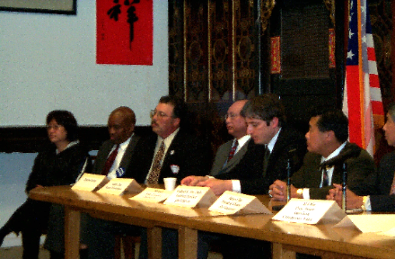 | Chinese 6 Companies Education Forum flanked by Assemby Speaker Pro Temp, Leland Yee; President Board of Supervisors, Matt Gonzalez Board of Education Member, Ed Chin |